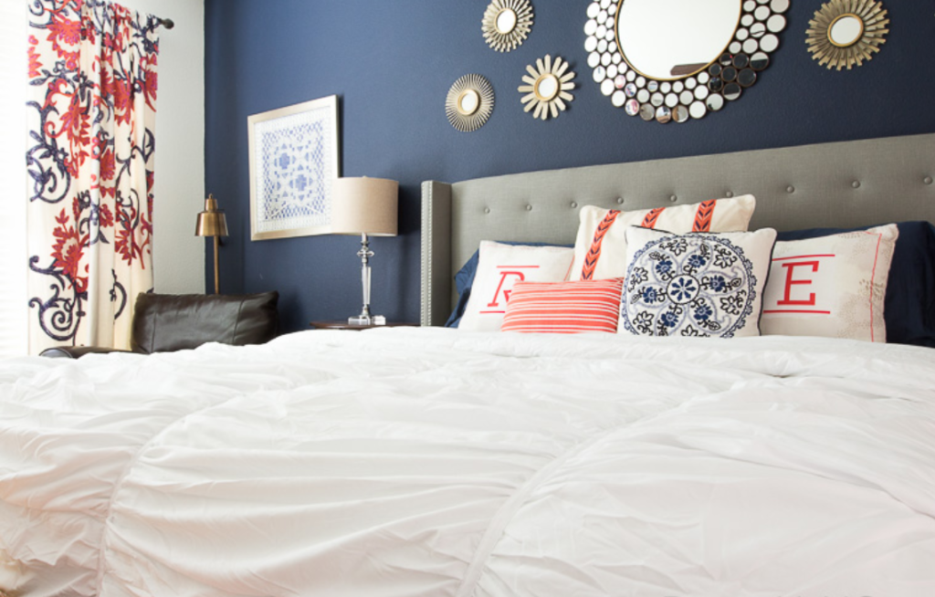 Instead of my usual sheets, I chose navy blue sheets at Walmart from BHG. It’s almost a perfect match for the paint on our wall! These Egyptian cotton sheets are so soft, they’re almost like silk. They have a 400 thread count. I am very particular about my sheets and these have met all of my expectations so far.